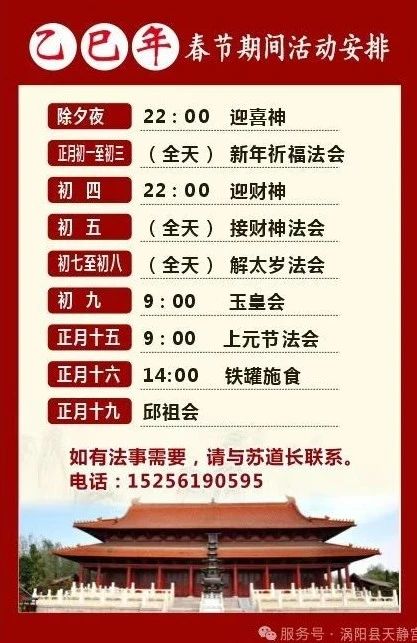 春节即将到来,为方便信众、游客入观敬香、祈祥纳福。天静宫于2025年1月28日(除夕夜)22:00时至2025年1月29日(大年初一)18:00时对外开放,2025年1月30日(大年初二)起,对外开放时间恢复至08:00--17:00。 敬请大家文明敬香,清香三炷,礼拜神仙,请在香炉内焚香,禁止烧高香、大香、劣质香。天静宫各殿堂内有免费香。 ···